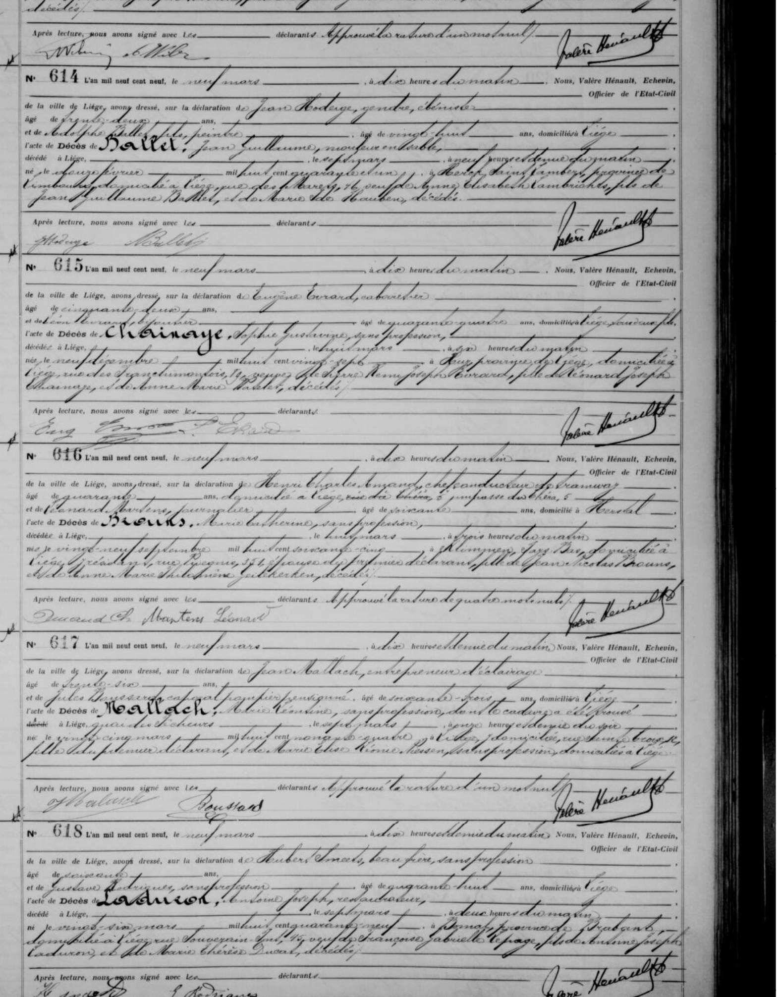 Na bijna 16 jaar huwelijk, sterft zijn vrouw in Luik op 8 maart 1909. In haar sterfakte (616) lezen we dat hij woonde in Luik in de impasse du Chéra, 5… en dat de overledene verbleef in de rue Vivegnis, 351, dat is ongeveer 3,5 km verder.
