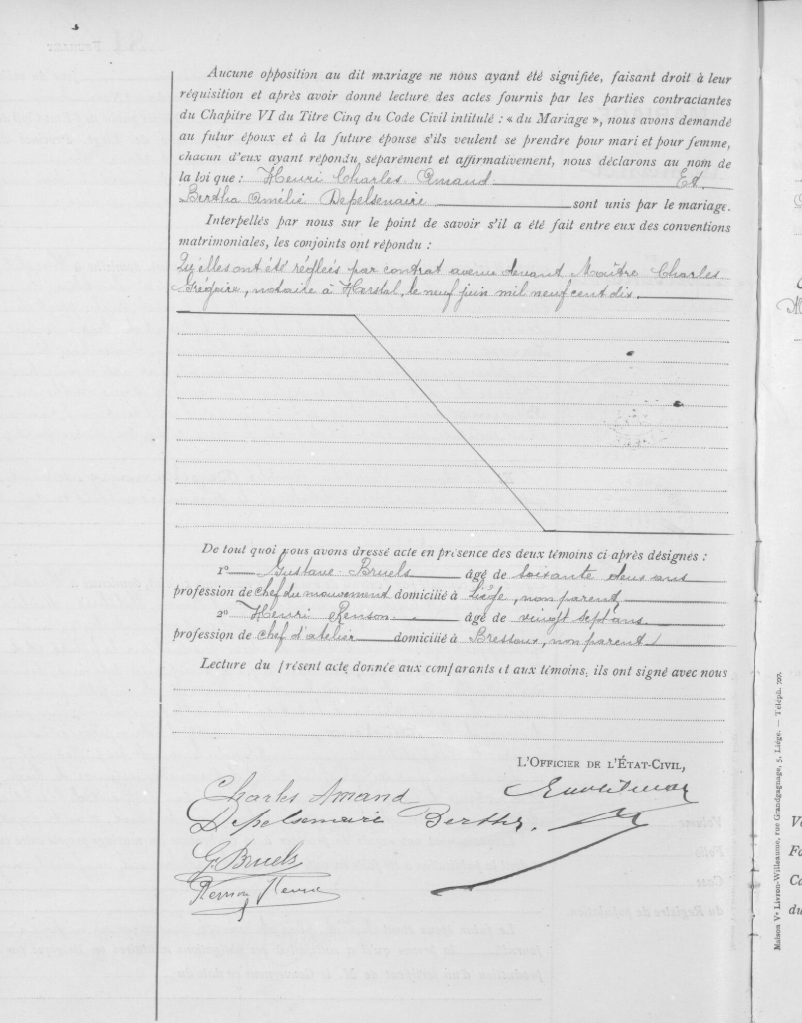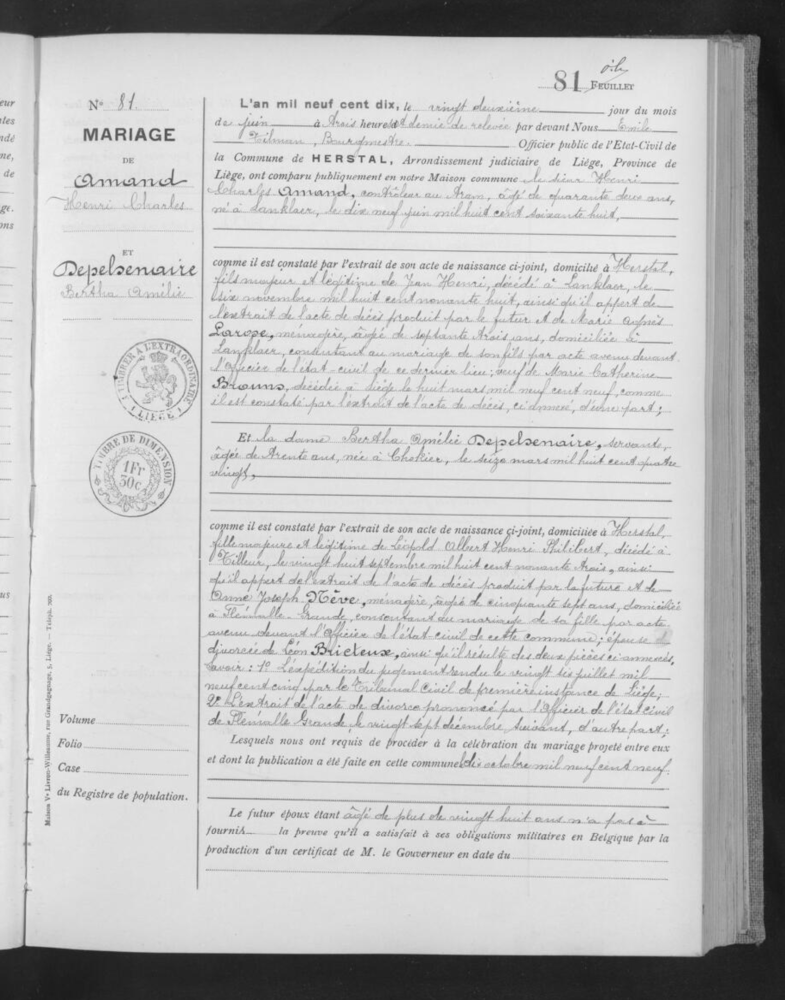 Volgens de huwelijksakte wonen ze beiden (al samen) op de quai Ste Barbe, nummer 4. In de huwelijksakte staat dat hij aan de militiewetten voldoet. Dat kunnen we beamen met enkele documenten uit de correspondentie van de Lanklaarse burgemeester. Op 8 maart 1895 vraagt hij een uittreksel uit het stamboek waaruit blijkt dat Henri Charles bij het 12de linieregiment dienst heeft gedaan, waarschijnlijk in Luik (zie http://www.abl1914.be/garnizoen/12linie.htm). Dat kan verklaren waarom hij zijn leven in Luik doorgebracht heeft.
