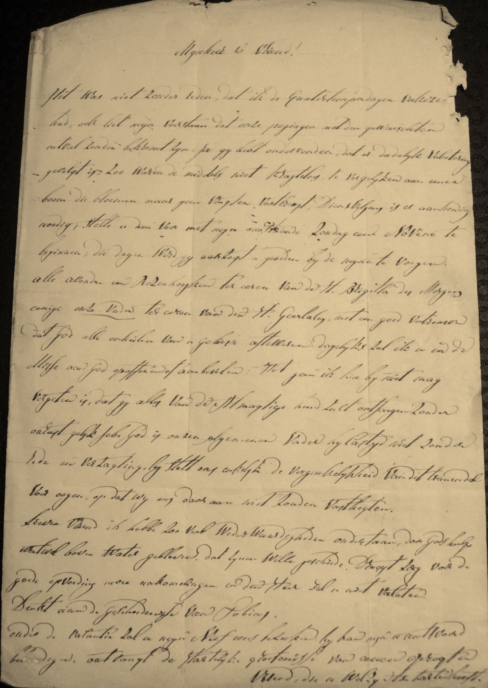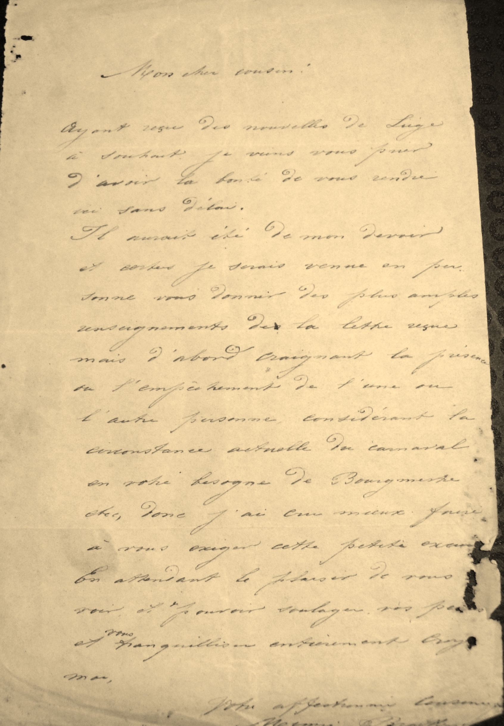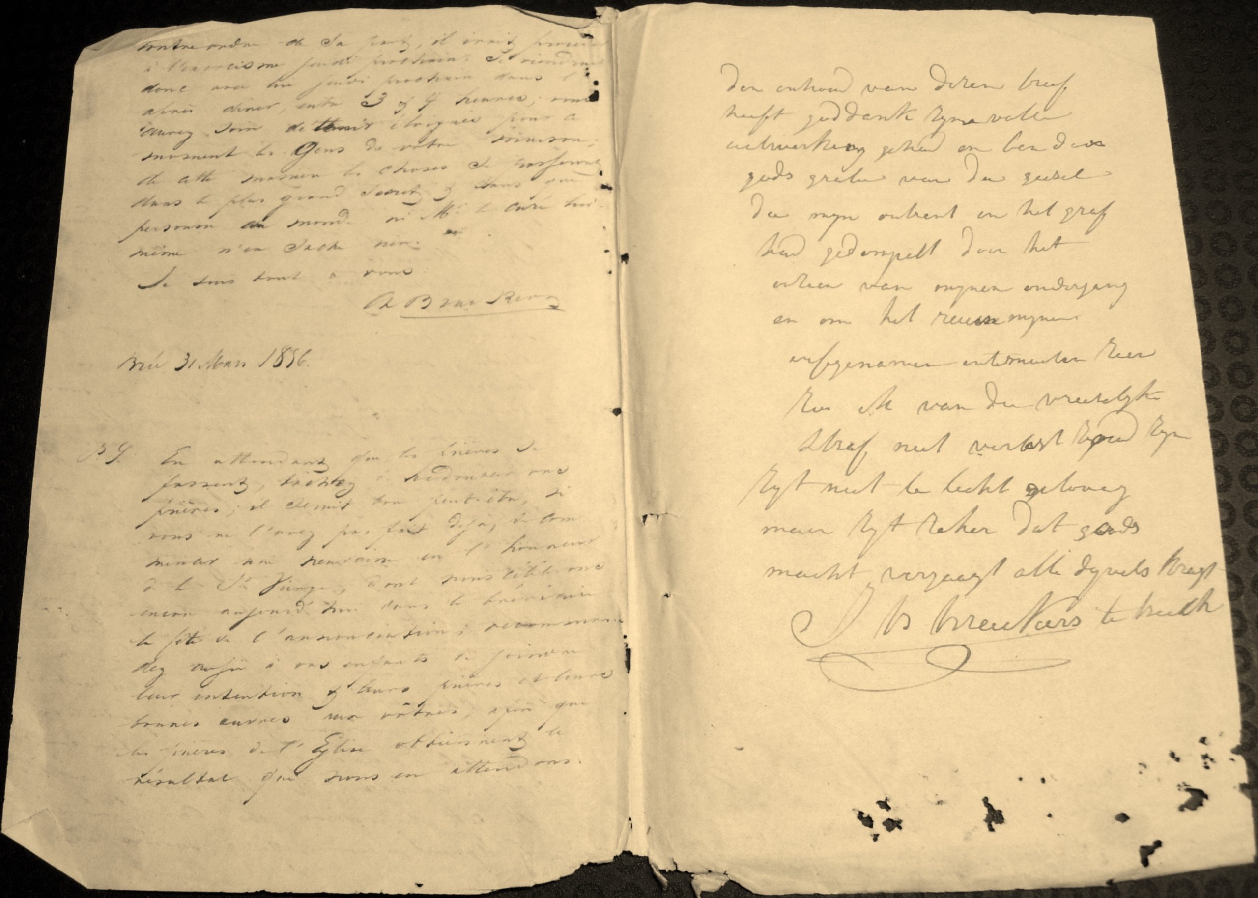 Tussen de opeenvolgende bladzijden zitten er ook losse documenten, waaronder een hele correspondentie met onder meer zijn nicht Mimie Braekers, een dochter van Nicolaas Hubert (°1775), een broer van zijn vader Willem Frans. Ze heeft hem 2 brieven (in het Frans) geschreven, in de eerste (transcriptie) vraagt ze Jan Bartel om naar haar toe te komen in Bree en in de andere (transcriptie)staat de datum van 3 april. Mijn nieuwsgierigheid is vooral gewekt door de reactie van Jan Bartel zelf die bij die brief gevoegd is. Daarin schrijft hij dat hij bijna in het graf was beland en dat hij door Gods gratie van de duivel is verlost.