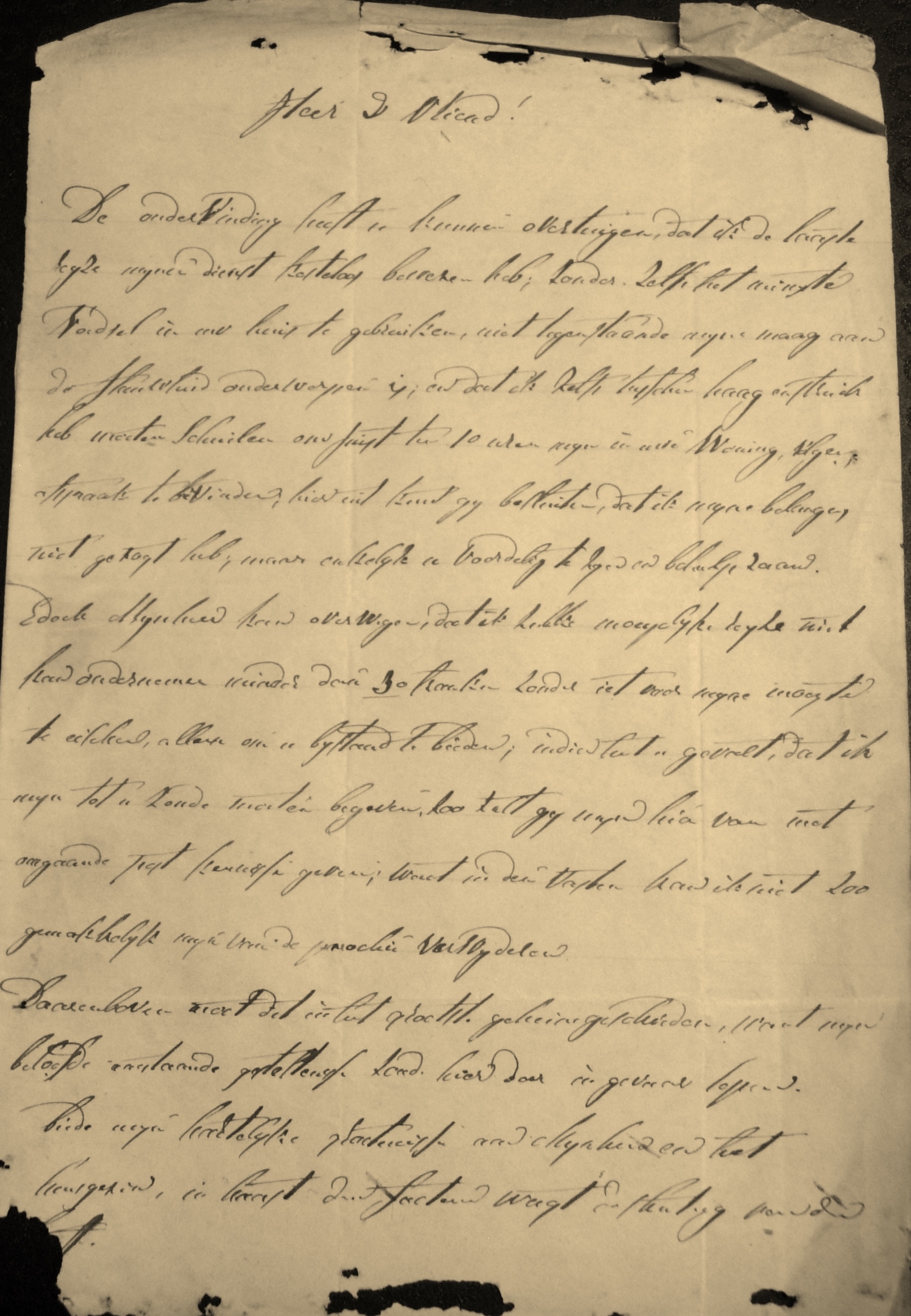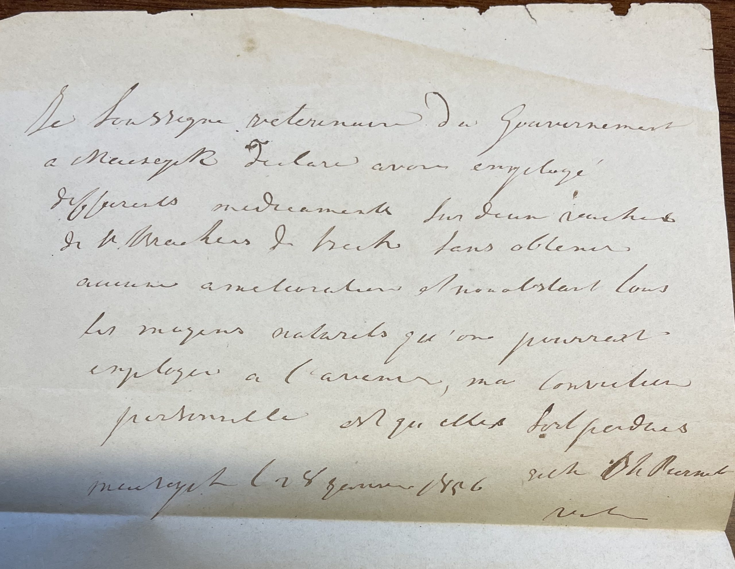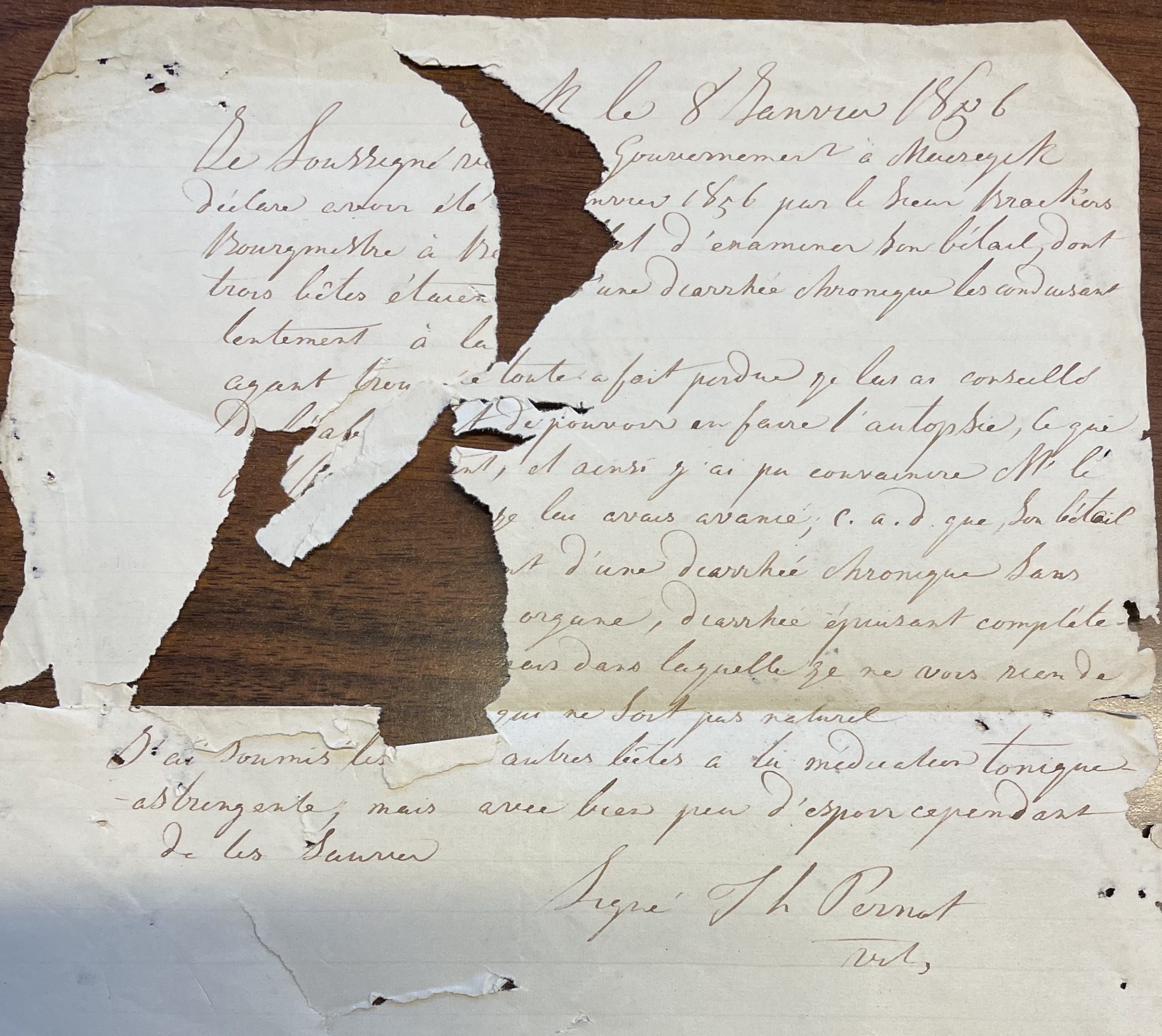 Ik probeer ook de context te begrijpen maar vind niet direct een reden voor zijn pijn en smarten. Het enige document uit die tijd dat enigszins wijst op onheil is een in het Frans opgestelde brief (die heel gehavend is en geschreven op 8 januari 1856). Daarin verklaart veearts J H Purnot dat hij door burgemeester Braekers gevraagd is om zijn veestapel te onderzoeken, waarvan 3 beesten lijden aan chronische diarree en die langzaam dood zouden gaan.Hij besluit een beest dat volledig verloren is te slachten en tot een autopsie over te gaan. Hij heeft inderdaad die chronische diarree vastgesteld die het beest volledig uitput. Een oorzaak kan ik in de gehavende brief niet vinden maar alles lijkt vrij natuurlijk. Hij heeft de twee andere beesten aan een “tonische samentrekkende medicatie” – une médication tonique astringente – onderworpen maar heeft weinig hoop dat ze het redden.