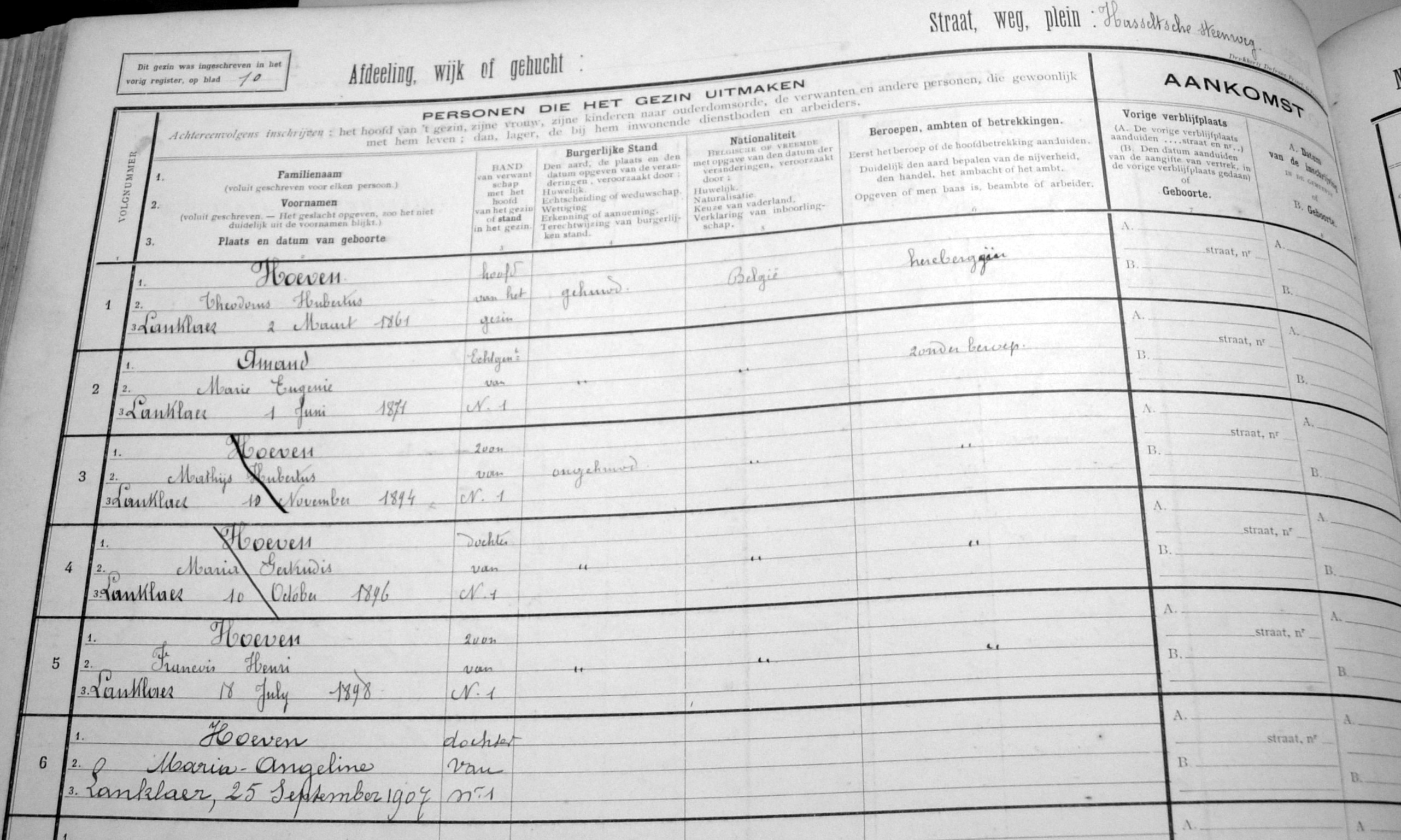 In het bevolkingsregister van 1900-1920 staat dat ze dan wonen op de Hasseltsche steenweg nummer 4. Dit klopt met wat “Linke” (Marie Angeline) – die nu ook in het register staat – mij nog verteld heeft. Zij noemde het wel de Bosstraat, de naam die de straat later gekregen heeft. Zo staat het ook op de identiteitskaart van Marie Eugenie, “Bosstraat, nummer 4”, in 1944, en op nummer 16 in 1948.